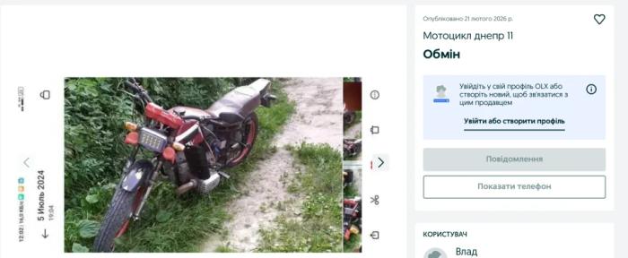 У категорії «Обмін» ми знайшли кілька пропозицій з транспортом та автомобільними аксесуарами. Зокрема, нам зустрівся лот з мотоциклом «Дніпро» 1976 року випуску. Транспорт має пробіг понад 37 тисяч кілометрів, двигун об’ємом 750 см³ і механічну коробку передач. Мотоцикл на ходу, однак потребує ремонту. Умовою обміну автор зазначає iPhone та пропонує розглянути різні варіанти.
