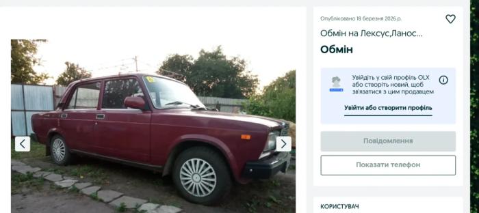 Також є оголошення про обмін автомобіля «ВАЗ 2107» 2004 року випуску. За словами автора, авто на ходу, технічно справне, зберігалося в гаражі та не фарбувалося. Автівку готові обміняти на Lanos або Lexus із доплатою.