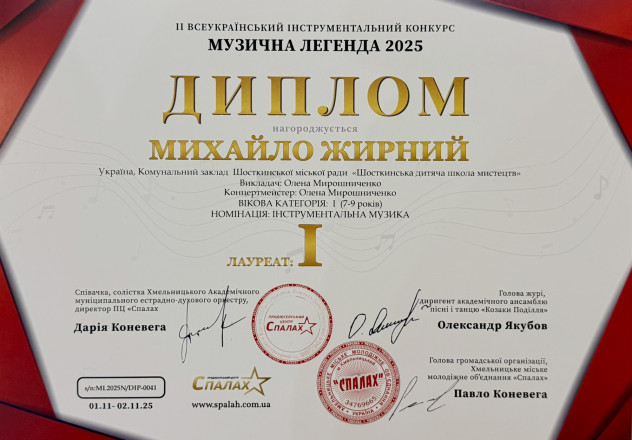 На початку листопада відбувся ІІ Всеукраїнський інструментальний конкурс «Музична легенда 2025». За результатами творчоих змагань учень 4-го класу фортепіанного відділу Шосткинської дитячої школи мистцетв Михайло Жирний отримав Першу премію в номінації «Інструментальна музика» (вікова категорія 7-9 років).