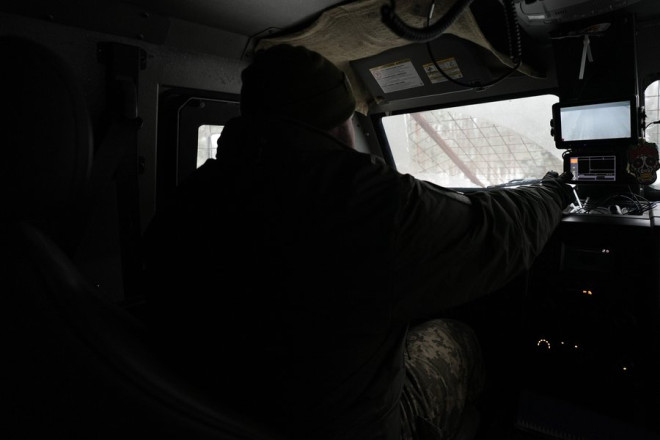 "Поважний" показує своє робоче місце. Через підвищену активність російських дронів на бронемашину для додаткового захисту кілька місяців тому встановили протикумулятивну решітку.