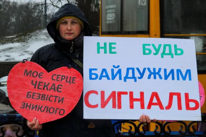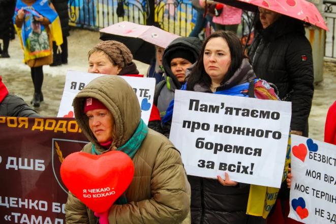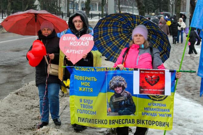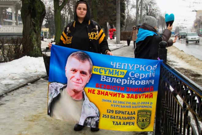 Мокрі долоні тримають портрети. Близько двохсот людей зібралося 14 лютого в Сумах біля фонтану «Садко». Рідні, близькі та небайдужі до долі безвісти зниклих та полонених вийшли на акцію, аби нагадати про тих, хто не досі повернувся додому.
