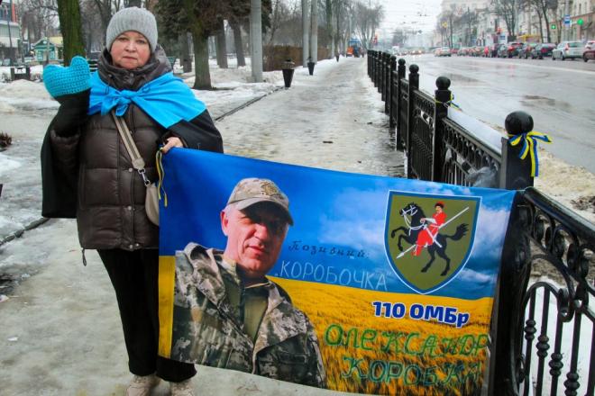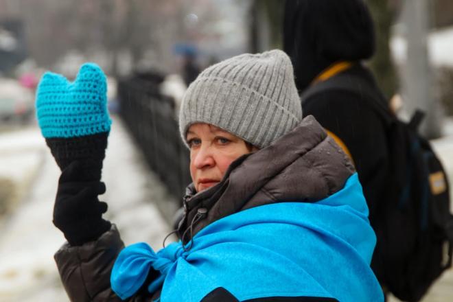 Блакитно-чорне серце тримає у руках Лариса Коробко. Жінка власноруч звʼязала оберіг, який бере з собою на акції. Вона вже більше року чекає на чоловіка Олександра, який зник безвісти.