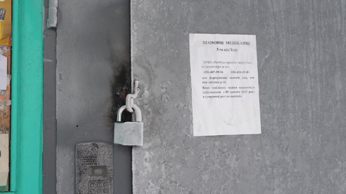 Поруч – оголошення про те, що мешканцям під’їзду речі з квартир можна забрати у супроводі рятувальників. Місцева жителька Людмила каже, що майно сусіди вивозять щотижня: "Вибирають меблі люди, забирають, що залишилося, що можна. Постійно".
