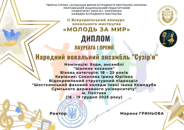 Народний вокальний ансамбль «Сузір’я» Шосткинського фахового коледжу ім.І.Кожедуба СумДУ взяв участь у ІІ Всеукраїнському конкурсі вокального мистецтва «Молодь за мир», який відбувся у грудні в Полтаві.