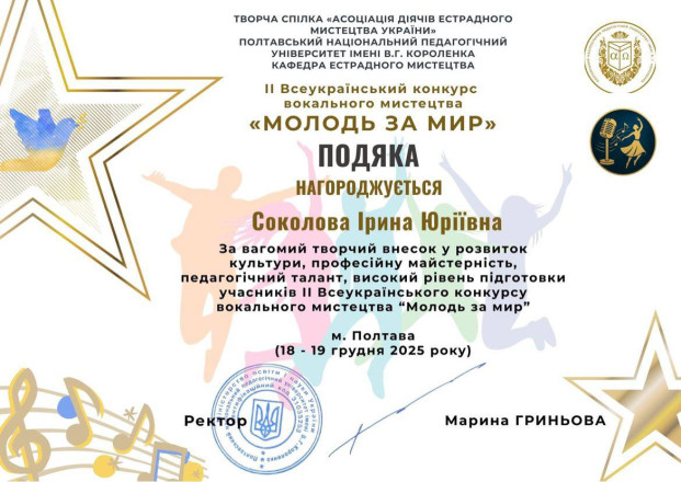 Керівниця ансамблю Ірина Соколова відзначена подякою за професійну майстерність, педагогічний тадант, вагомий внесок у ррозвиток культури, підготовку учасників конкурсу вокального мистецтва.