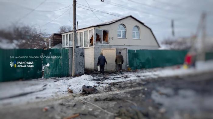 За повідомленням мерії Сум, унаслідок атаки пошкоджено вікна та дахи кількох приватних домоволодінь, розташованих поблизу місця влучання. Пожежу, що виникла після удару, оперативно локалізували.