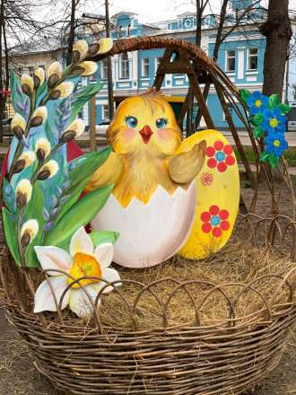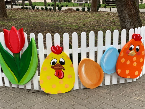Майстри та учні власноруч створили казковий простір: величезні писанки з традиційними орнаментами, затишні гніздечка, тематичний «парканчик» із веселими курчатами та крашанками.