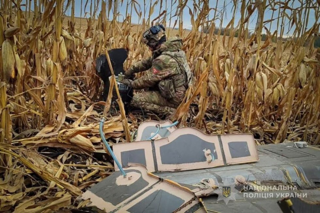 Збитий Силами оборони України ворожий ударний безпілотний літальний апарат виявив комбайнер під час збору врожаю кукурудзи на полі в одному з районів області. Про свою знахідку він одразу ж повідомив поліцію.