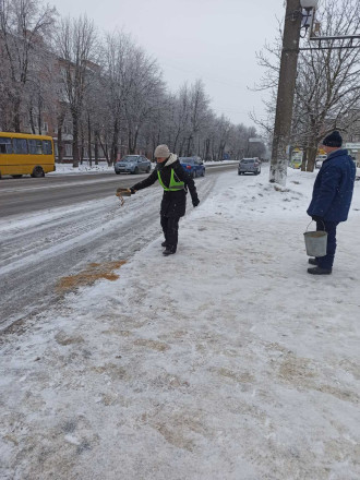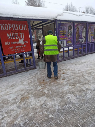 Працівники підприємства здійснюють посипання зупинок громадського транспорту та тротуарів для запобігання ожеледиці й забезпечення безпечного пересування пішоходів.