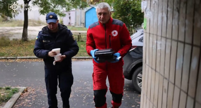У Шостці офіцери-рятувальники громад спільно з представниками Червоного Хреста разносять гарячі обіди маломобільним, одиноким людям похилого віку.