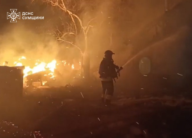 Як повідомили у ГУ ДСНС Сумської області, на місці удару спалахнула масштабна пожежа в житловому секторі.
