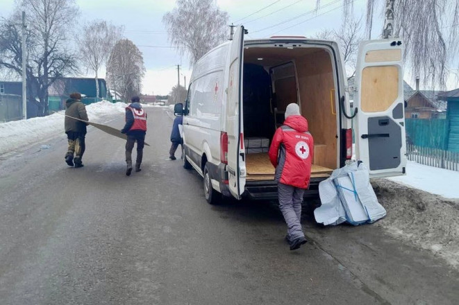 У селі Крупець люди отримують будівельні матеріали після російської атаки, 3 березня 2026 року. Сумська обласна організація Товариства Червоного Хреста України