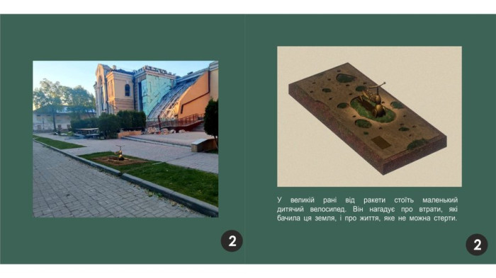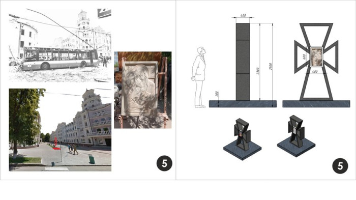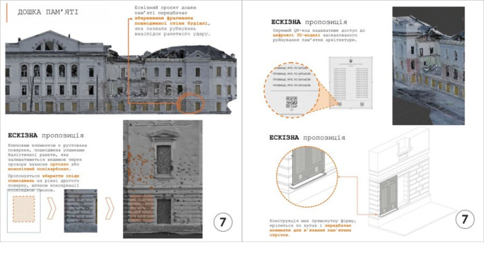 "Зруйнований фрагмент фасаду закріпити епоксидною смолою, що буде видно через прозоре оргскло або полікарбонат. На поверхні скла розмістити прізвища та імена загиблих і QR-коди з інформацією про них. Дошка пам’яті вирішена в мінімалістичному стилі. Колір: темний на білому, або білий на темному. Розмір – 2,5 на 2,0 метри. Дошка має бути підсвітленою. Передбачено елементи для пов’язування пам’ятних стрічок і поличка для покладання квітів", — йдеться в повідомленні про проєкт № 7.