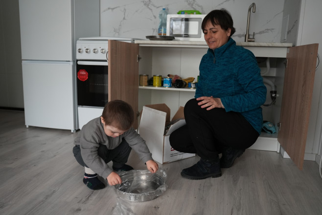 Переселенці з прикордонного Краснопілля, Ольга та Микола Байди, заселилися у нову квартиру кілька годин тому. Через посилення обстрілів родина виїхала з рідного селища рік тому: спочатку жили на Полтавщині, а потім повернулися на Сумщину й мешкали у знайомих. Там і дізналися про можливість подати заяву на проживання в модульному містечку.