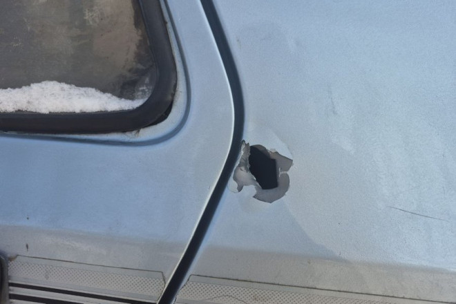 "Ось пробило осколком, ось вм'ятина, фару розбило. Я був на роботі. Майно не постраждало, фіранку лише відчинило. А у сусіда он вікно вилетіло на третьому поверсі, і тут, на балконі, вікна, двері повідчиняло. А так переважно все ціле".
