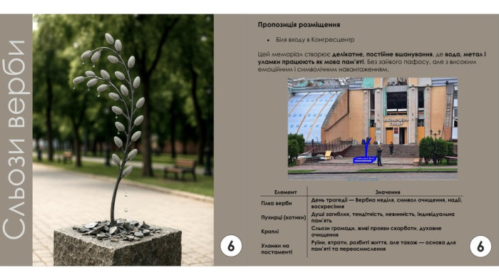 "Скульптурно-водна інсталяція у вигляді символічної гілки верби з 35 пухирцями-котиками. Через гілку подається вода, яка крапельно стікає на пухирці, накопичується на кожному з них, а потім падає краплею на постамент з уламків – як символ сльози, що проростає з болю та зберігає пам’ять", — йдеться на платформі.