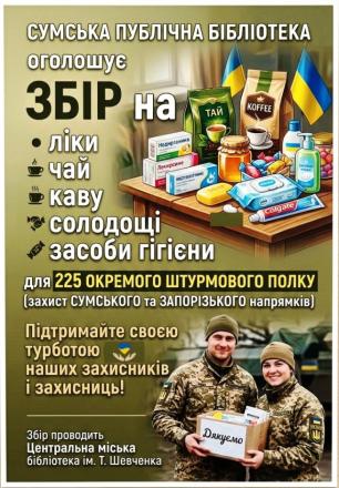 Сумська публічна бібліотека оголосила про збір гуманітарної допомоги для бійців 225-го окремого штурмового полку. Акція спрямована на забезпечення базових потреб військових, які зараз виконують бойові завдання на сумському та запорізькому напрямках.Реклама: