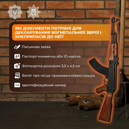 Із 25 листопада 2024 року в Україні триває процедура декларування знайденої або отриманої вогнепальної зброї. Ця кампанія дозволяє громадянам законно зафіксувати наявне озброєння, що було знайдене або отримане під час війни, та уникнути кримінальної відповідальності за його незаконне зберігання.