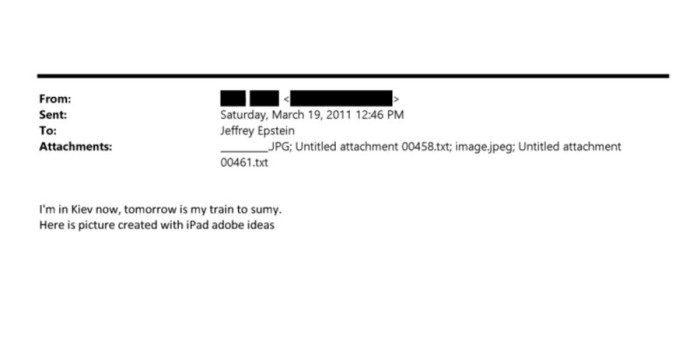19 березня 2011 року невідома людина написала Джеффрі Епштейну: "Я у Києві зараз, завтра мій потяг до Сум".