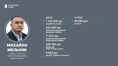 За 2025 рік Михайло Мельник заробив на посаді голови РДА 1 767 019 грн. Від Сумської ОДА отримав ордени, медалі, знаки, кубки на 2780 грн. ТОВ "Енера Суми" заплатило Мельнику 209 785 грн, а БО "Право на захист" виплатило йому 5620 грн. Також він продав Анні Ігнатенко нерухоме майно на суму 71 014 грн.